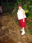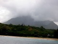 И все же мы доехали до конца на следующий день. Это был по многим параметрам необыкновенный день. Во-первых, дорога оказалась сказочно красивой: местами петляющее шоссе проходило как будто в тоннеле из огромных деревьев, смыкающихся вершинами и образующих длинную и даже мрачноватую арку. С дороги открывался вид на возвышающийся на горизонте горный массив Wainihapali и гору Wai'ale'ale - самое дождливое и влажное место на земле. На ее вершине постоянно сидело облако дождя и только в редкие мгновения удавалось разглядеть саму вершину. Последняя точка шоссе - городок Ha'ena. Это чудесный пляж, на котором можно даже стоять с палатками, это великолепное купание, особенно с маской и ластами: открывается совершенно необыкновенно красочный и разнообразный подводный мир, это удивительная пещера-грот с низко нависающим каменным сводом, как будто специально выдолбленная в скале и, наконец, это очень трудный, но поразительный по красоте маршрут на вершину горы, с которой открывается потрясающий вид на океан и пляжи - на то самое недоступное северное и северо-западное побережье, которое не видно с пляжа. Как говорит указатель, это 11 мильный дневной поход в одну сторону, но можно пройти всего 2 мили - и это-мол доступно людям любого возраста. Ну что тут скажешь! Мы пошли, решились только на этот самый 2-х мильный переход, но и он лично мне оказался не по зубам, точнее не по ногам. С самого первого момента дорога круто пошла в гору, причем дорога эта была просто нагромождением камней, по которым приходилось буквально забираться с помощью руки идущего впереди Аркадия. Но это все еще было вполне доступно, если бы не мысль о том, как я пойду обратно? Ведь это гораздо труднее. Поэтому я благоразумно остановилась где-то на середине пути, выбрав небольшую площадку с отличным океанским обзором, с зарослями великолепных деревьев и кустами с какими-то крупными, похожими на фикус толстыми листьями, которые были сплошь "украшены" надписями, вроде "Маша+Петя=любовь" или еще более значительная "Здесь был Вася!" - эти надписи четко видны на фотографии - а Аркадий пошел дальше. Я посидела на камушке, отдохнула, а он забрался совсем высоко, ну если не на самую вершину, то дошел до такого места, откуда ему открывалось это скалистое побережье, круто обрывающееся к океану, и сделал оттуда потрясающие снимки. На обратном пути он захватил меня и сумел довести до конца, хотя это было нелегко. Мне кажется, что в этот день мы пролили весь пот, предназначавшийся для недельного отдыха на Гавайях.