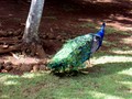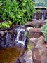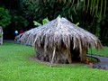 Итак, первый и самый близкий маршрут лежал на восток, в г. Wailua и водопады недалеко от него. С первых шагов по острову природа нас просто поразила своим разнообразием и буйной тропической растительностью. Шоссе привело нас к единственной на острове судоходной реке, достигающей в ширину метров 50-70, по которой плыл этакий прямоугольный туристский пароходик, с которого доносились гавайские песни. Мы решили обязательно на нем прокатиться и в один из последних дней таки прокатились. Вид на водопады с моста через речку был хоть и очень красив, но они были довольно далеко. А вот на берегу реки внизу мы разглядели старинную гавайскую деревню и поехали туда. Это оказался музей-деревня Камокила, в которой были представлены разные строения с табличками и пояснениями, что каждое из них означает. Например, родильный дом, где внутри был специальный плоский камень, на котором и происходило само действие и травы и листья растений, из которых добывали масло и натирали этот камень - местная дезинфекция, дом, где едят мужчины, дом-баня и дом-прачечная, дом - этнографический музей с посудой, фруктами и орудиями труда, военный дом с устрашающей фигурой перед входом (рядом с Аркадием). Около одного из домов лежал "камень любви" в виде сердечка, расколотого пополам. На табличке было написано примерно следующее: "Love rock, но это не то, что вы думаете! Этот камень символизирует разбитое любовью сердце". Дом - это сильно сказано: на самом деле небольшая лачуга, покрытая банановыми листьями с земляным полом. И кругом совершенно неописуемая бурная растительность с огромными листьями, деревья, перевитые лианами - настоящие, классические джунгли. А какие там цветы! Представляете, огромное дерево, усыпанное крупными ярко-оранжевыми цветами, а оказывается это просто "цветочек" - африканский тюльпан! Я уж не говорю о цветущих бананах - я впервые увидела, как они растут и как цветут, удивительное зрелище. И вообще, все такое огромное, сочное, яркое. И еще одна "достопримечательность" деревни и острова Кауаи вообще: целые стаи петухов и павлинов. Они живут тут везде, мы встречали их по всему острову и они - петухи - орут дурными голосами и в разное время суток. Вид у них у всех бойцовский: у многих перья торчат из хвостов, частично выдернутые соперниками в тяжелых боях. У павлинов хвосты красивые, правда мы ни разу не видели их распущенными, но даже в "сложенном" состоянии они производят впечатление. Самочки павлинов гораздо скромнее, хвосты не распускают, держатся скромно, но с достоинством, ну все как у людей! J