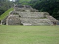 Ну наконец мы добрались до развалин Майя - древний город Алтун Ха. Массивные сооружения типа мавзолея, составленные из огромных каменных блоков (причем, часть этих блоков сохранилась именно с древних времен, а часть уже восстановлена по образцу в наши времена), представляют собой могилы древнейших служителей церкви Майя (Temple B4). В захоронениях были обнаружены скелеты примерно 80 человек, в среднем каждый около 170 см роста, предположительно завернутые в красную ткань. Там же были обнаружены "нефритовые головы". "Нефритовая голова" - это наиболее хорошо известная, тщательно вырезанная из нефритового минерала, голова божества, Бога Солнца, Kinich Ahau, с круглыми близкопосаженными глазами, размером примерно 15 см и весом около 4,5 кг. Эти мавзолеи соседствуют с широкими постройками из необработанного нефритового минерала, покрывающими всю область развалин майя. Temple B4 - это также место жертвоприношений майя, но в данной местности это не были человеческие жертвоприношения. Наш экскурсовод показала нам также дерево, из ствола которого индейцы майя изготавливали каное. А потом пустила всех желающих полазать по этим развалинам. Можете себе представить, с каким удовольствием все полезли на самые верхушки пирамид и Аркадий был там в первых рядах! Ну а я и еще парочка таких же "туристок", остались внизу.