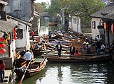 Итак, прилетев в Шанхай, мы не остановились в нем ни на минутку, а сразу же поехали дальше. Шанхай был у нас в конце пути, а сейчас маршрут наш лежал в "небольшой городок" (2,5 млн жителей) - Сучжоу. Но вначале мы заехали в "деревушку" Чжанчжоу (400 тысяч жителей). Мы пробыли там совсем недолго, походили по торговой улице и зашли в некоторые дома с сохранившейся старинной архитектурой. Нам показали, как строили дома в древности: обязательный высокий порог, через который надо было переступать только правой ногой, обязательная перегородка, закрывающая вход злым духам, комнаты для приема гостей, комнаты для молитв и т.д. Отдельные комнаты для жен и наложниц, обычно на втором этаже. Старинная тяжелая деревянная мебель, картины и скульптуры, изображающие императоров. Обычно во дворах разбиты красивые садики, обязательно с камнями, водой и растениями. Если во дворах проложены мостики через озерца, то они обязательно зигзагообразные - тоже защита от злых сил, которые не могут ходить зигзагом, такие вот они прямолинейные.