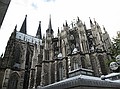 Строительство собора началось в 12-ом веке . Это было величественное огромное сооружение, высота среднего нефа составляла 43 метра, а окна верхнего ряда высотой более 17 метров, были выложены из цветного стекла. В 1790-ом году каркас собора еще не был закончен, а уже требовался его ремонт и только 59-метровая башня упиралась в небо, представляя как бы могучий обломок, но зато она давала возможность представить масштабы задуманного строительства. Строительство собора завершилось в 1880 году, однако доделки и ремонтные работы велись еще и после торжества по поводу открытия собора (что-то это немного напоминает нынешние времена, правда? Некое Дежа вю) . После войны реставрационные работы начали с устранения повреждений, нанесенных бомбардировками. Ходила легенда, что собор не был сильно разрушен потому, что представлял собой хороший ориентир для бомбардировщиков. Однако легенда осталась легендой: во время войны было разрушено 95 процентов города, население уменьшилось с 800 до 40 тысяч. В точном соответствии с замыслом архитекторов средневековья были восстановлены буквально из пепла все пилястры, фиалы, башенки, розетки, галереи, скульптуры. В соборе хранятся сокровища и драгоценности, собранные здесь за долгие столетия, которые невозможно просто все перечислить.