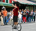 А вот этот парень, стоящий на велосипеде - совершенно особое действо. Мы просто случайно сели отдохнуть на скамеечку