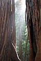 Сразу хочу заметить, что в тот момент, когда мы гуляли по Redwoood парку, конечно, никакого фотоаппарата у нас еще не было и сделать фотолграфии мы не могли. Все фото к этому рассказу сделал Валера и дал мне попользоваться. И надо скзать, сделал он их просто замечательно. В одно из воскресений в середине июня мы решили устроить себе большой спортивно-познавательный день. Примерно в часе езды от нас - это около 150 км - находиться великолепный, красивейший парк - Redwood park. Но это не то самое красное дерево, из которого делали такую замечательную мебель, и насколько я помню, один из младших Большаковых специалист именно краснодеревщик. Расположен он на склонах довольно крутых гор, так что гулять по нему, прямо скажем, сложновато. Автомобильная дорога проходит через весь парк, извиваясь серпантином как змеюка, то вверх, то вниз вокруг гор. В некоторых местах организованы стоянки для машин. Внизу в ущелье течет речка, прозрачная и чистая, усеянная камнями и не очень глубокая, так что ее можно спокойно перейти вброд. По берегам речки тоже растет лес, но он редкий и есть полянки, на которых устраивают пикнички местные путешественники. Все бы ничего,но уж больно глубоко в ущелье течет речка. Туда-то мы по широкой большой дорожке спокойненько спустились и не заметили высоты, а обратно - ! Мы решили не идти обратно по длинной дороге, а пойти коротким путем прямо в гору - это градусов 50 - 55 вверх по заросшей деревьями и немного осыпающейся тропинке - в общем, Большой Спортивный День! Я, конечно, пыхтела, как паровоз, но считаю, что вышла с честью из этого положения. Ну а что представляет собой сам лесопарк? Это просто очень трудно рассказать, настолько необычное зрелище. Представьте себе, огромный в 3 обхвата темнокрасный ствол у основания (мы с Аркадием мерили, действительно даже больше 3-х обхватов обеими руками!). Очень прямые и огромной высоты деревья и не резко сужающиеся кверху. Ветки похожи на сосново-еловые и все почти наверху. Поэтому получается наверху как бы общая крона над всем лесом. Мало того, эти здоровенные стволы на некотором расстоянии от земли раздваиваются или даже растраиваются, а из некоторых корней растет по пять прямых огромного диаметра деревьев, как сиамские близнецы частично сросшиеся между собой. И вот такие "близнецы" окружают полянку, т.е. стоят по окружности, образуя закрытое пространство. Полное впечатление, что они собрались на семейный совет и шумно решают важные проблемы. И таких деревянных сборищь по всем склонам гор довольно много. Заходишь внутрь этого пространства, слушаешь как шумит крона наверху, как деревья разговаривают между собой и даже кажется, что вот-вот еще немного и начнешь понимать их язык. Не знаю, чем объяснить мое ощущение, но оно не было страхом, эти деревья не пугали, а как бы заигрывали со мной, даже несмотря на темноту из-за кроны. Но, видимо, из-за того, что лес довольно темный, почти не видно было птиц, или они были где-то слишком высоко наверху. Тишина и покой в этом лесу и только внизу журчит речушка - чудное место для отдыха. Мы даже решили с Аркадием, что когда наша семья вся соберется здесь, мы съездим туда на пикничок (мечты-мечты, надо ведь еще, чтобы "детишки" тоже этого захотели). Очень забавную сценку мы там наблюдали. Идет парень, нагруженный рюкзаком и прочими сумками-сетками. Улыбается, что-то напевает по