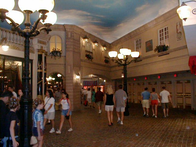 - узнаете? Те кто там был и даже те, кто не был, безусловно поверят, что это-таки Париж. Правда, это все пока еще на улице, не в помещении, и размеры слегка приуменьшены по сравнению с настоящими, но на Эйфелеву башню можно залезть, вернее, подняться на лифте и обозреть окрестности. Но мы решили, что тратить на это время пока! не будем, тем более, что это было уже вечером, а рекламу и все огни лучше смотреть снизу, прямо перед собой, а не сверху. Итак мы пошли внутрь - и попали просто на Парижские улицы под опять же Парижским сумеречным небом. Не совсем дневным, потому что уже горят фонари и в домах зажглись огни