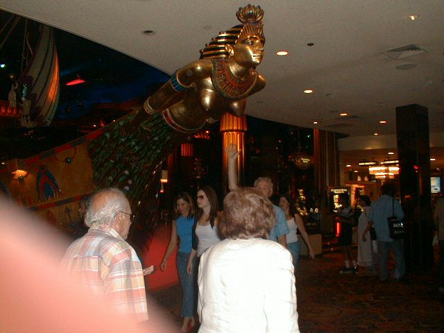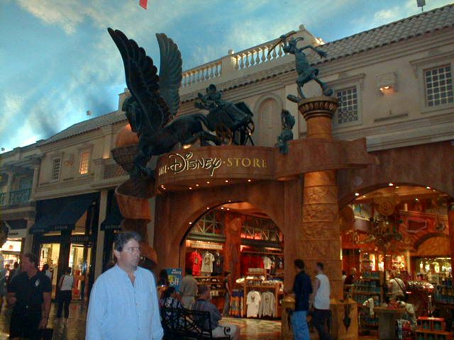 Венеция. Снимок сделан уже вечером, поэтому с трудом, но все же можно прочесть на боковой поверхности сверху вниз название "Venetian" - величественное зрелище с прекрасной подсветкой. Но снаружи оно производит меньшее впечатление, чем внутри. Ну конечно же, пройдя сквозь казино, как сквозь строй, и пару раз спросив у служителей, куда нам надо идти, потому что мы знали, что ищем, мы попали на "второй" этаж. На самом деле это конечно же не второй, а какой-то верхний, потому что казино само занимает наверно насколько этажей - там очень высокие потолки - но называется второй этаж. И вот тут мы просто обладели, мы попали на улицы, вернее набережную канала в Венеции. Самый настоящий канал, довольно длинный, по которому ходят гондолы с гандольерами и гандольершами в национальных одеждах, которые катают желающих и поют им серенады - и все это на фоне ярко-синего слегка облачного неба. Помимо просто зрелища, оказывается бывает здесь еще уличный карнавал с представлениями и парад гондол вдоль всего канала, но это только 2 раза в день - утром и вечером, мы на него не попали, да просто не знали - за всем не уследишь за одну поездку. Но это просто потрясающее впечатление, когда ты с вечерних, темных, полных огней и рекламы улиц Лас Вегаса вдруг попадаешь под ласковое синее небо Венеции. Но это еще не самое потрясающее, на набережных все читанные-перечитанные дворцы Дожей, мостики через канал, уличные ресторанчики и кафе, официанты в национальных костюмах, итальянские полицейские - ну просто атас! Мы специально сделали снимок часов крупным планом, чтобы все видлели: это без 10 минут двенадцать ночи!